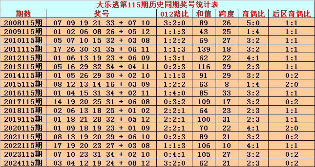 要而言之,大乐透第2025115期前区012路比参考2:0:3。