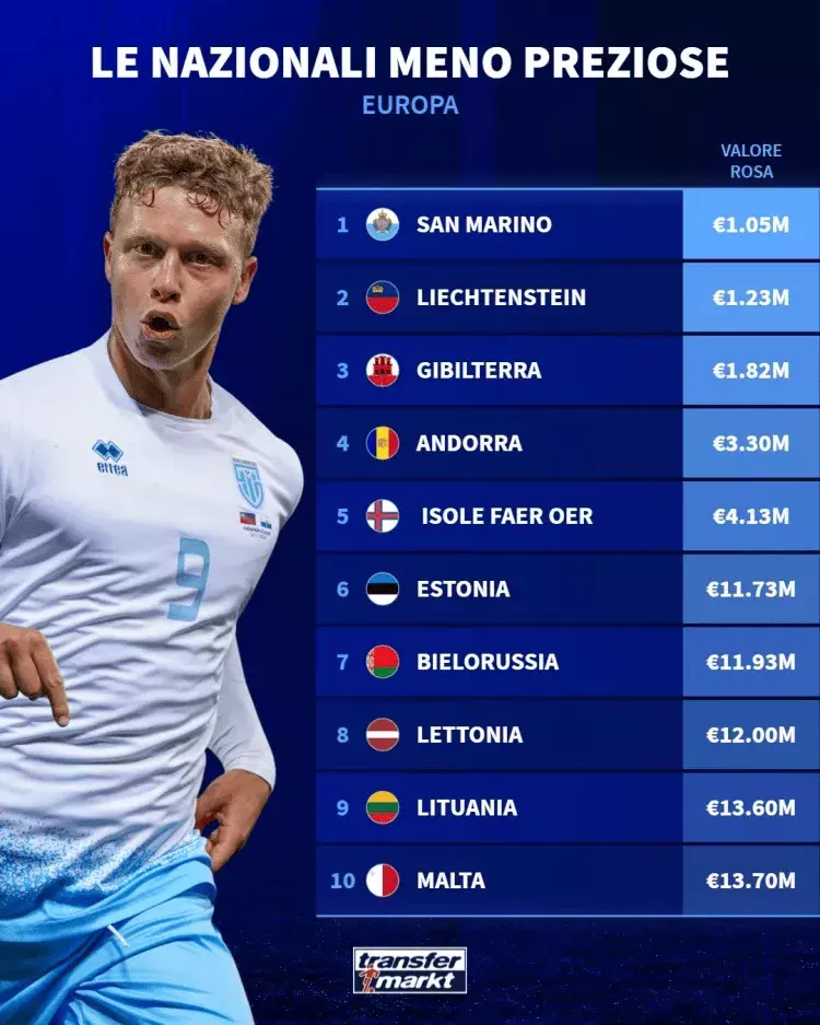 德国转会市集统计了身价最高的欧洲国度队,和身价最低的欧洲国度队,分辨列出了榜单,服气如下: